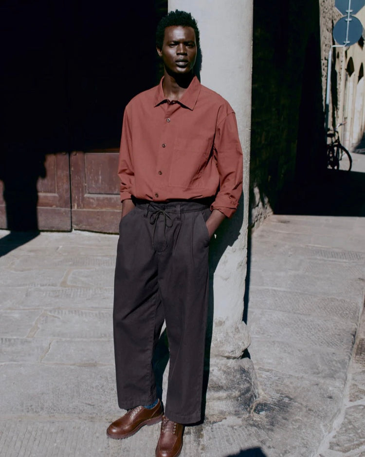 Cotton canvas. Garment-dyed. Belt loops. Double reverse-facing pleats. Side pockets. Back buttoned flap pockets. Notched back waistband. Wide legs. Buttoned French bearer.