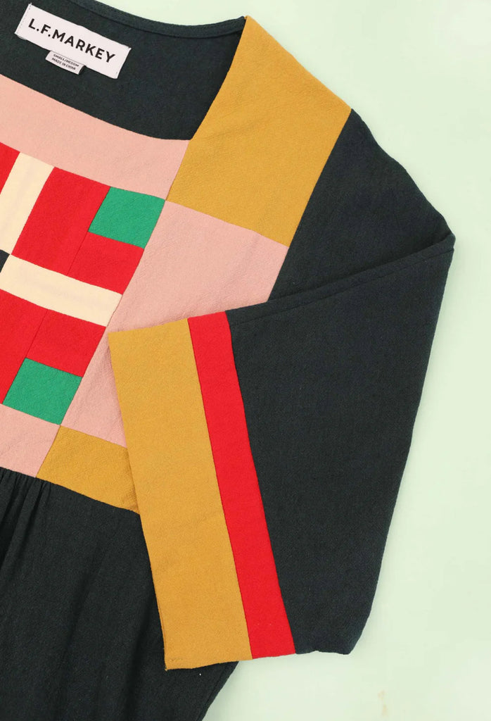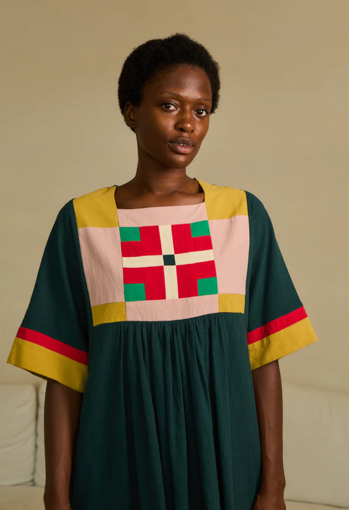 The Rafe Dress is a boxy, wide cut smock dress with a square neckline. With gathered detailing below the chest adding volume to the shape. In a patchwork of bold colours inspired by folk quilting traditions.