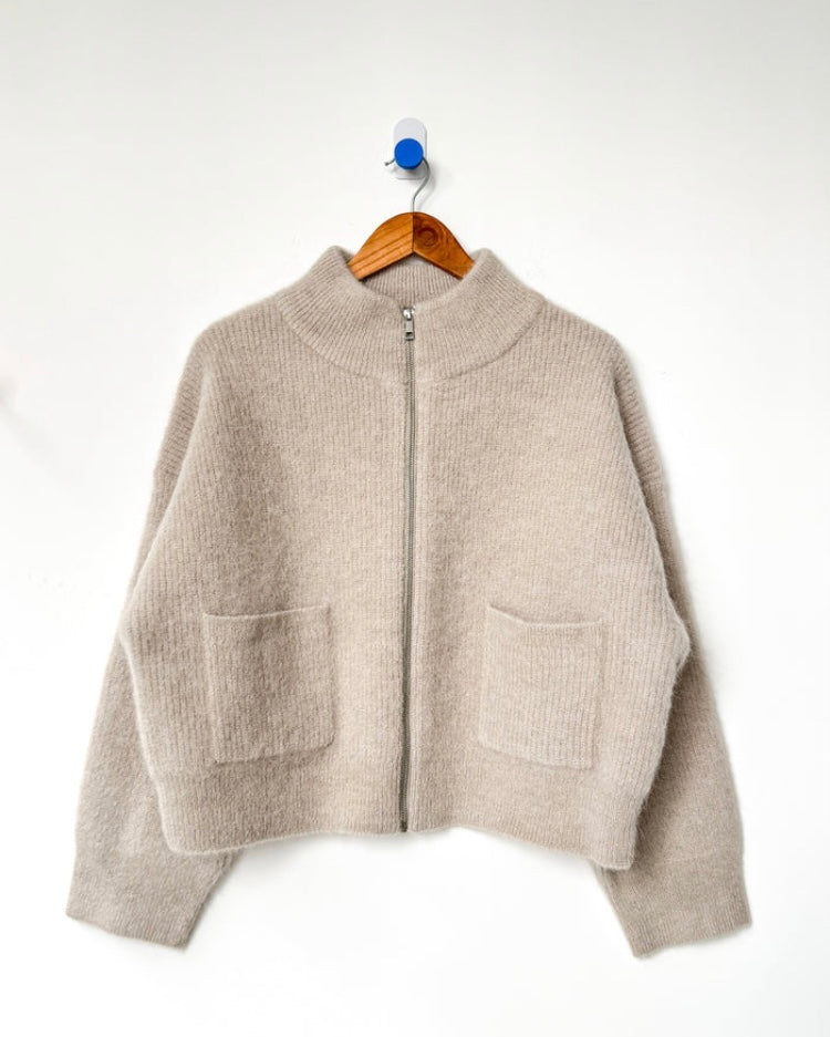 An elevated spin on the classic cozy sweater, the Alpaca Zip Front Jacket is crafted from a soft wool blend with a luxe hand feel. Designed with a mock neck, front pockets, and an easy zip closure, it’s the perfect layer for both relaxed days and more polished looks.