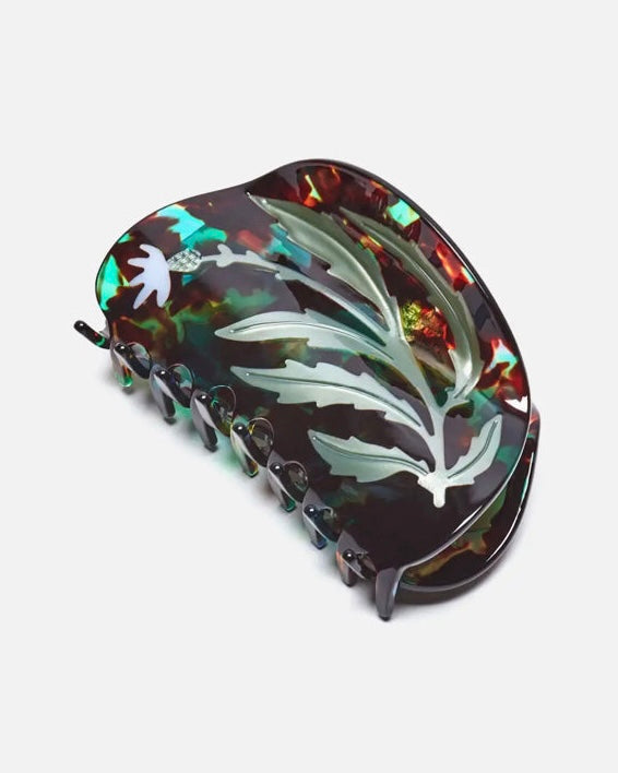 Vervain Deep Claw Offering protection against evil spells and shielding personal spaces from negative energy, Vervain lives up to its name as the ‘enchanters herb’. Druids brewed a magical elixer of Vervain to promote creativity and enhance receptiveness to prophecy. Known throughout time and across cultures as a healing and protective force, this unwilting flower is here to help you resist pressure or outside influence. Our Vervain Claw Features a bounty of slim silvery green leaves beneath a petite purple bloom encompassed by a subtle blue green tortoise shell acetate.