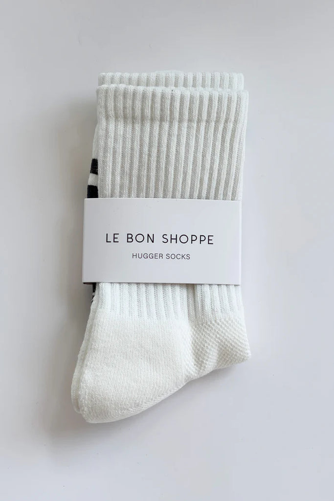 The introvert with a bubbly personality. Say hi to the Hugger Socks. Built on the same classic crew-length base as the Boyfriend Socks, with a clean, solid leg and a playful surprise underneath. A silicone motif on the sole adds a light grip, perfect for hugging flats, clogs, and slides.