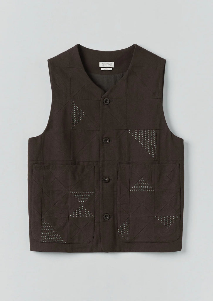 A beautifully crafted cotton gilet. Made from patchwork organic cotton canvas. Embroidered with kantha stitching in tessellated triangular motifs, reminiscent of the arrangement of twentieth-century ceramic floor tiles.