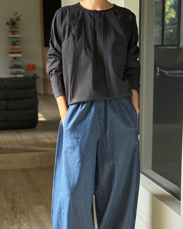 A nod to the ever-evolving blouse, the Julienne Top features thoughtful design details that speak for themselves. A round neckline with a front keyhole closure sits at the center of delicate pleating and charming raglan sleeves. It maintains a relaxed, slightly curved shape, making it easy to wear both tucked or untucked. Its lightweight cotton texture is crisp and airy—a dreamy staple for dressing up or keeping it casual.
