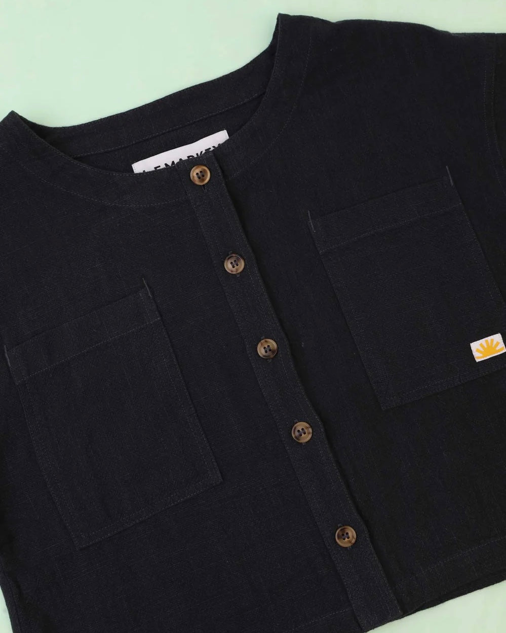 The Beau Top is a cropped, boxy top with a round neckline, and imitation horn buttons down the front. Faatures wide mid length sleeves, front patch pockets and our mini sun woven patch logo. Crafted from a textured navy cotton linen blend in a dusty navy blue.