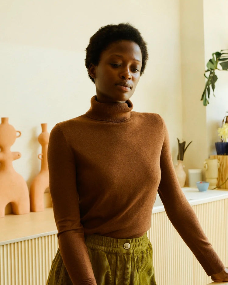 Roll neck. Fine knit. Long sleeves. Ribbed edges. Slim-fit.